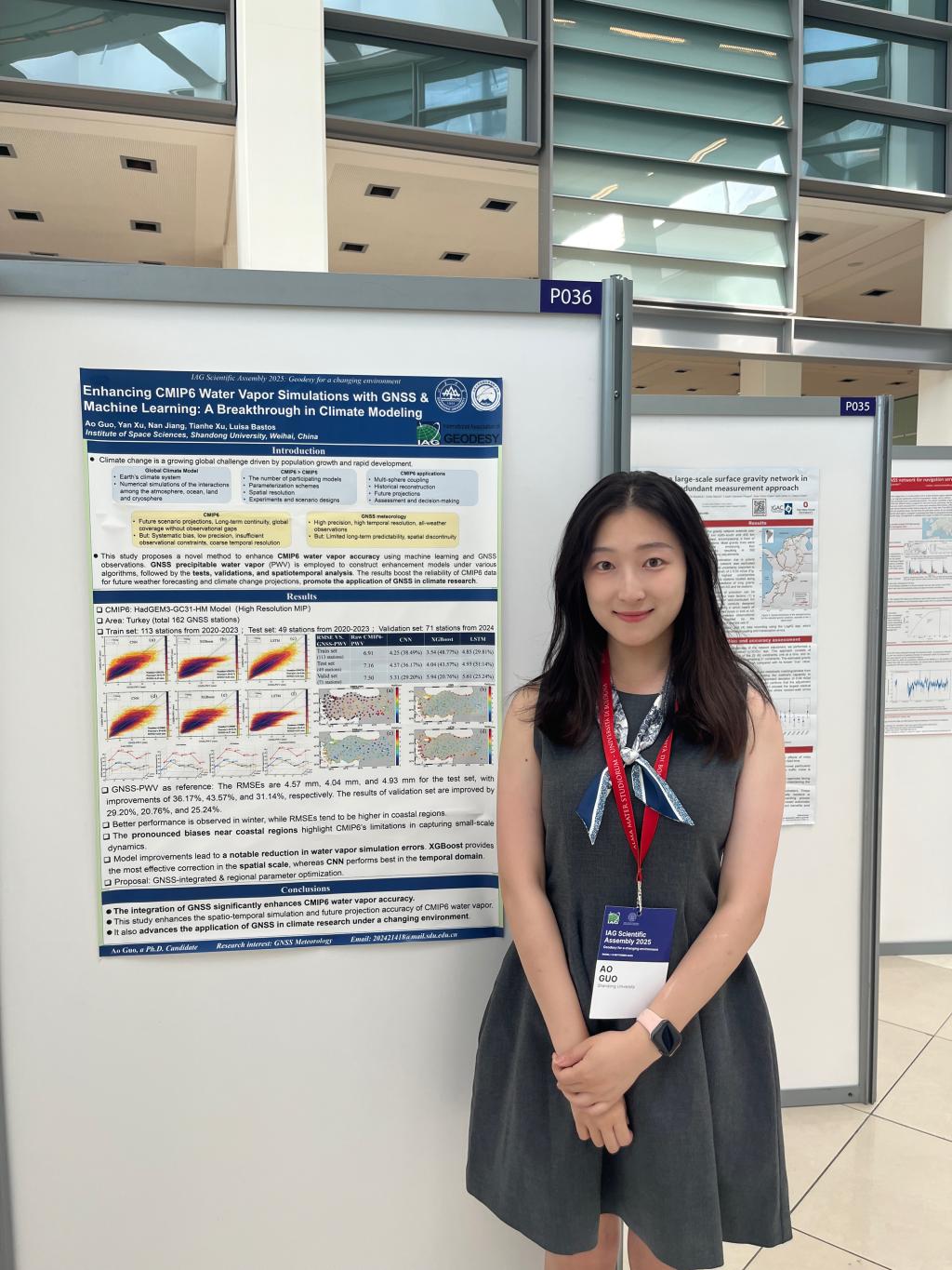 许艳副教授作题为“Response analysis of multiple atmospheric parameters during the 2023 boreal summer heat wave: A case study in mainland Spain”的口头报告,揭示了2023年西班牙地区热浪期间的大气异常响应。江楠副教授作题为“GNSS PPP Augmentation with Remote Sensing PWV under Different Surface Types”的展板报告,展示了利用遥感水汽增强GNSS精密定位的最新研究。博士后李默闻作题为“A Rigorous Semi-Tightly Coupled Model for the Integration between GNSS and INS”的展板报告,提出了一种GNSS与惯性导航系统融合的半紧耦合模型。博士生郭奥作题为“Enhancing CMIP6 Water Vapor Simulations with GNSS and Machine Learning: A Breakthrough in Climate Modeling”的展板报告。